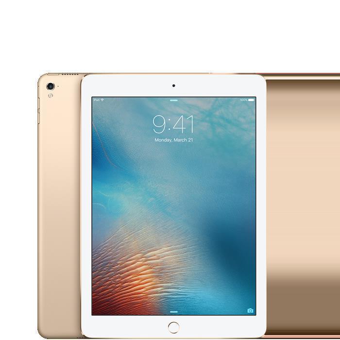 Das 9,7 Zoll iPad Pro ist eine Kombination aus Mobilität und Leistung. Nur 6,1 mm dünn und 450 g leicht, hat das iPad Pro ein Retina Display mit True Tone. Das sind Sensoren, die das Display an seine Umgebung anpassen, damit es angenehm anzusehen ist. Es überzeugt mit einem A9X Chip mit 64-Bit Desktoparchitektur, 4-Lautsprecher-Audio, iSight und FaceTime HD Kameras, Touch ID Fingerabdrucksensor, WLAN und LTE Advanced Verbindungen und mit bis zu 10 Stunden Batterielaufzeit. Um die LTE-Verbindung in Deutschland nutzen zu können ist es notwendig, eine Apple-Simkarte zu nutzen. Das iPad Pro verfügt über ein goldenes Gehäuse und hat 128 GB Speicherkapazität.